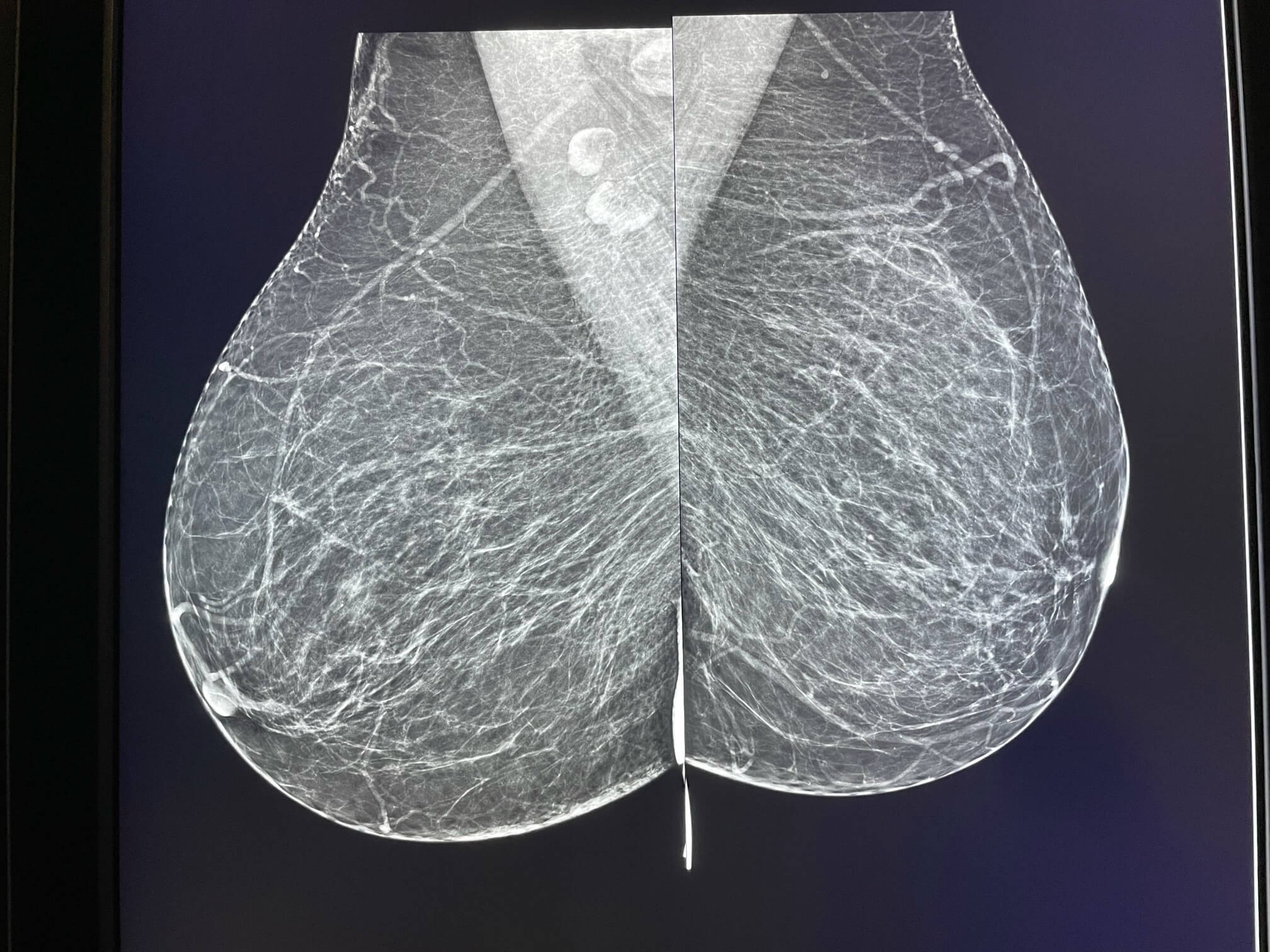 La mammographie met en évidence un surcroît d’opacité rétro-mamelonnaire d’aspect inchangé par rapport à l’examen de 2018, considéré à l’époque comme un reliquat fibro glandulaire banal.